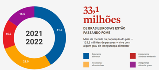 Junto ao cenário de pobreza citado, as tendências apontam para o aumento acentuado na insegurança alimentar no Brasil nos últimos anos. Nos resultados divulgados com base na Escala Brasileira de Insegurança Alimentar (EBIA) são usadas quatro categorias: segurança alimentar, insegurança alimentar leve, insegurança alimentar moderada e insegurança alimentar grave. A projeção de 2021/2022 mostra que mais da metade da população do país vive com algum grau de insegurança alimentar, sendo 33,1 milhões na categoria grave.
