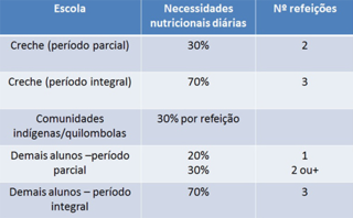 Com o objetivo de atender às necessidades alimentares dos estudantes, o Fundo Nacional de Desenvolvimento da Educação (FNDE), na Resolução 26, de 17 de junho de 2013, dispõe sobre os padrões nutricionais a serem seguidos nas refeições escolares. Conforme lista a Organização das Nações Unidas para Alimentação e Agricultura (FAO), no Brasil se estabeleceu um mínimo de calorias supridas por faixa etária e tipo de ensino. Nas escolas de tempo integral, com três refeições diárias, para as crianças de 6 a 10 anos são 1.000 kcal e, para a faixa de 11 a 15 anos, 1.500 kcal. Esses valores correspondem ao percentual de 70% da quantidade energética necessária. A tabela abaixo mostra as orientações para as demais modalidades de ensino.